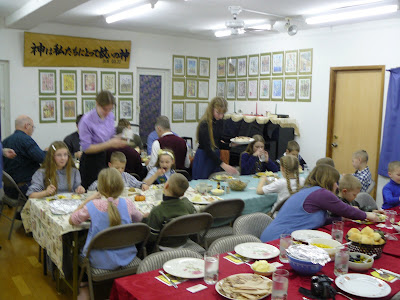 We were blessed to hold the annual thanksgiving fellowship here and we were able to welcome the newest family to the northern area of Japan, the Wilhites to our rambunctious crowd!! We are able to special order turkeys so this is the one time of year that we splurge on this wonderful ‘treat’, then the ladies divide up the fixin’s. (how much does a turkey cost here you ask??…are you ready for this?? AT today’s rate for a 22 lb turkey it was $96!!) Now you know why we use everything clear down to scraps for the dog’s thanksgiving and the carcus for soup and appreciate being able to take some leftovers home from the day!).